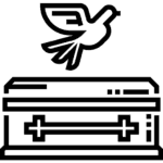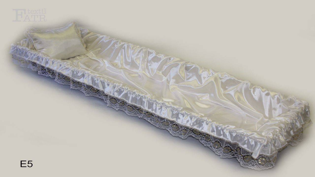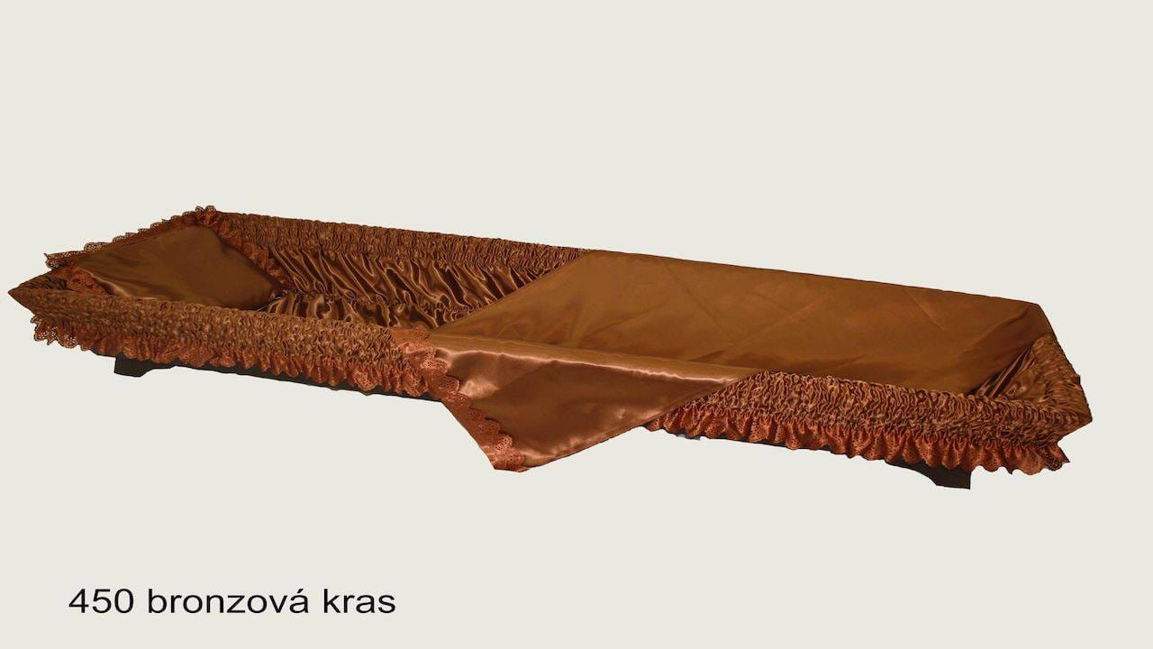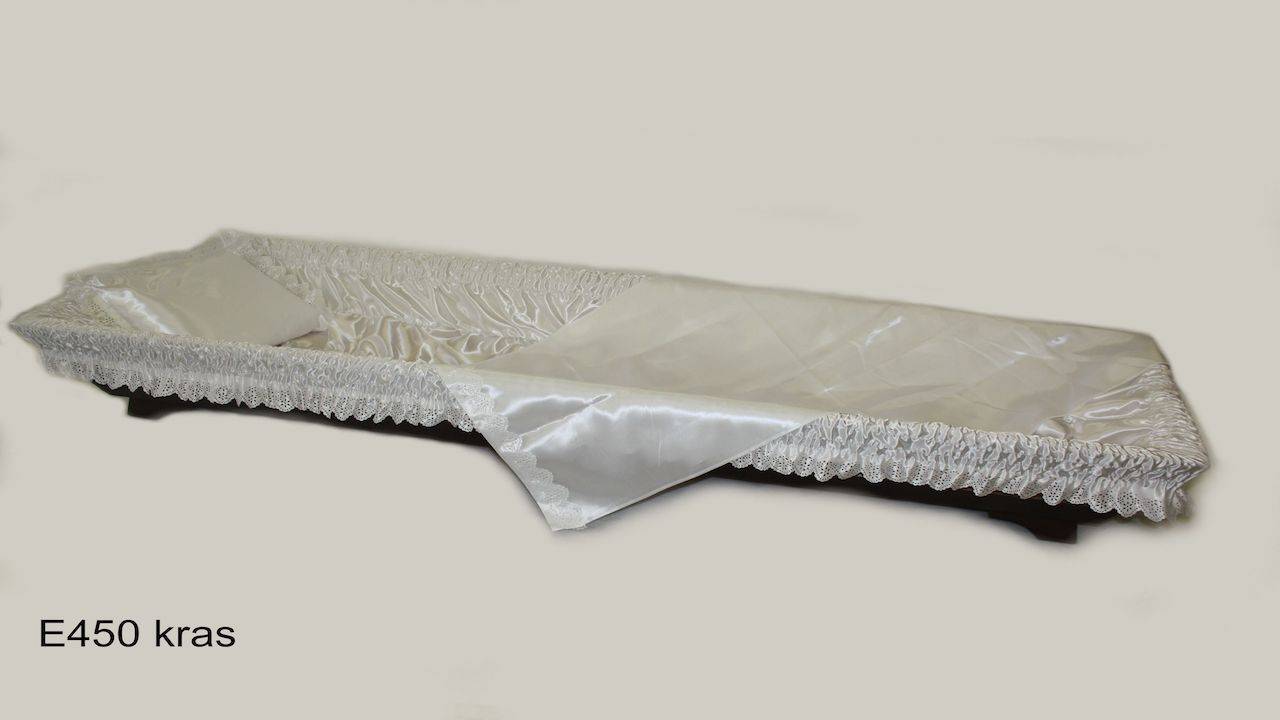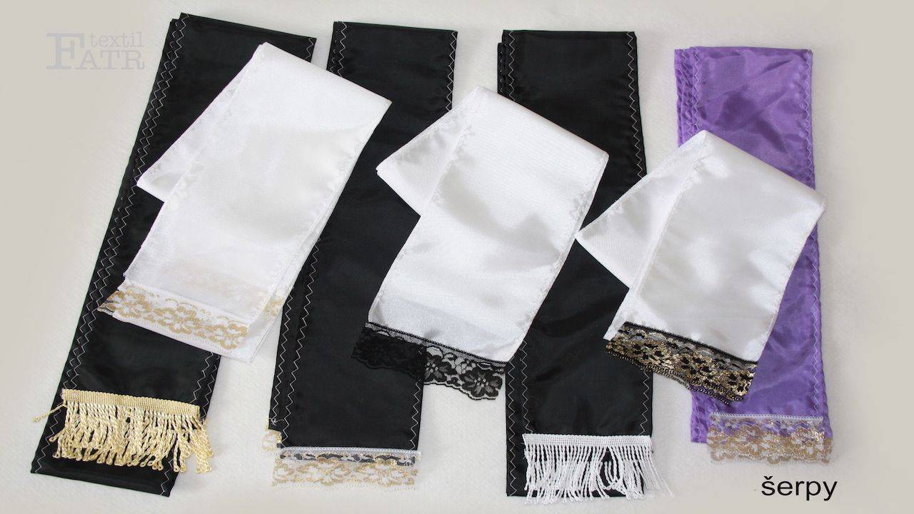 Přehozy a dečky, šerpy, rubáše, polštáře, tašky na kremační urny, hrobové lemy, přehozy na transportní vozíky a kostelní máry.